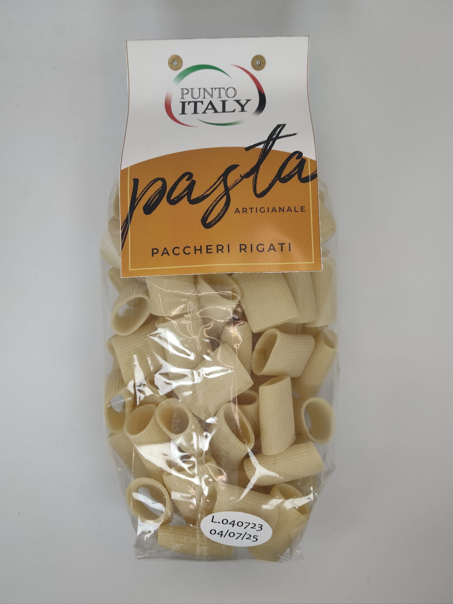 Paccheri rigati are a traditional pasta from Neapolitan cuisine, known for their large, tube-like shape and ridged surface. Their size and texture make them perfect for holding hearty sauces, such as ragù, seafood-based preparations, or creamy cheese blends. This versatile pasta is a staple of Italian gastronomy, bringing a touch of authenticity and warmth to both classic and innovative recipes.